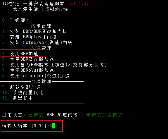 如果服务器系统是 CentOS,先输入 数字 1 安装内核,然后 重启服务器 后,输入 数字 4 启动 BBR 原版加速。