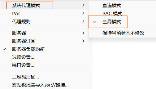 启动SSR客户端后,右键SSR客户端图标,选择第一个“系统代理模式”,里面有3个子选项,选择"全局模式“,之后就可以用浏览器翻墙。